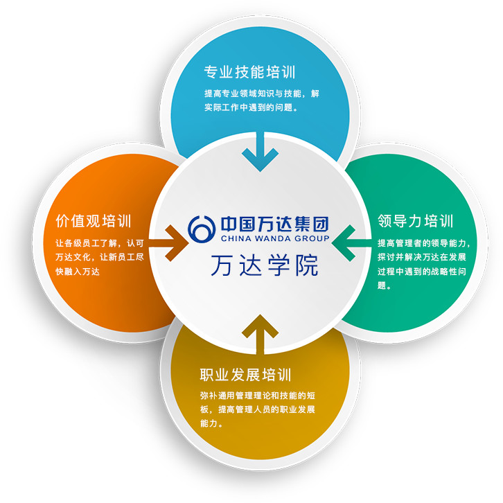 2013年7月,萬達學院正式成立,標志著萬達集團員工培訓發展工作進入新的里程碑。萬達學院由5個職能部室與5個培訓單元構成。職能部室包括行政管理處、測評管理處、外聯管理處、職前培訓管理處和提升培訓管理處,配套設立了圖書閱覽室和檔案室。培訓單元包括素質拓展中心、益智中心、教學中心、電子信息中心、競技中心等。
