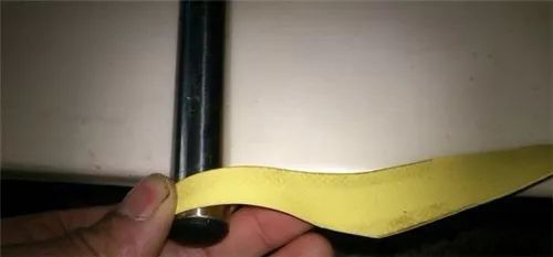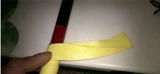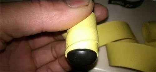 將先前剪好留有斜角的一面貼合握把末端的邊緣,然后均勻的纏繞起來,此時(shí)可稍微用點(diǎn)力,以防在今后使用中散掉。