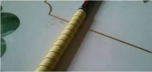 然后就是收尾了,其實(shí)收尾和開始一樣,就是在纏繞帶上面剪出一個(gè)斜角,用來貼合魚竿的圓形。大家可以先找一支筆在纏繞帶上面做個(gè)記號,以方便剪的更加準(zhǔn)確。