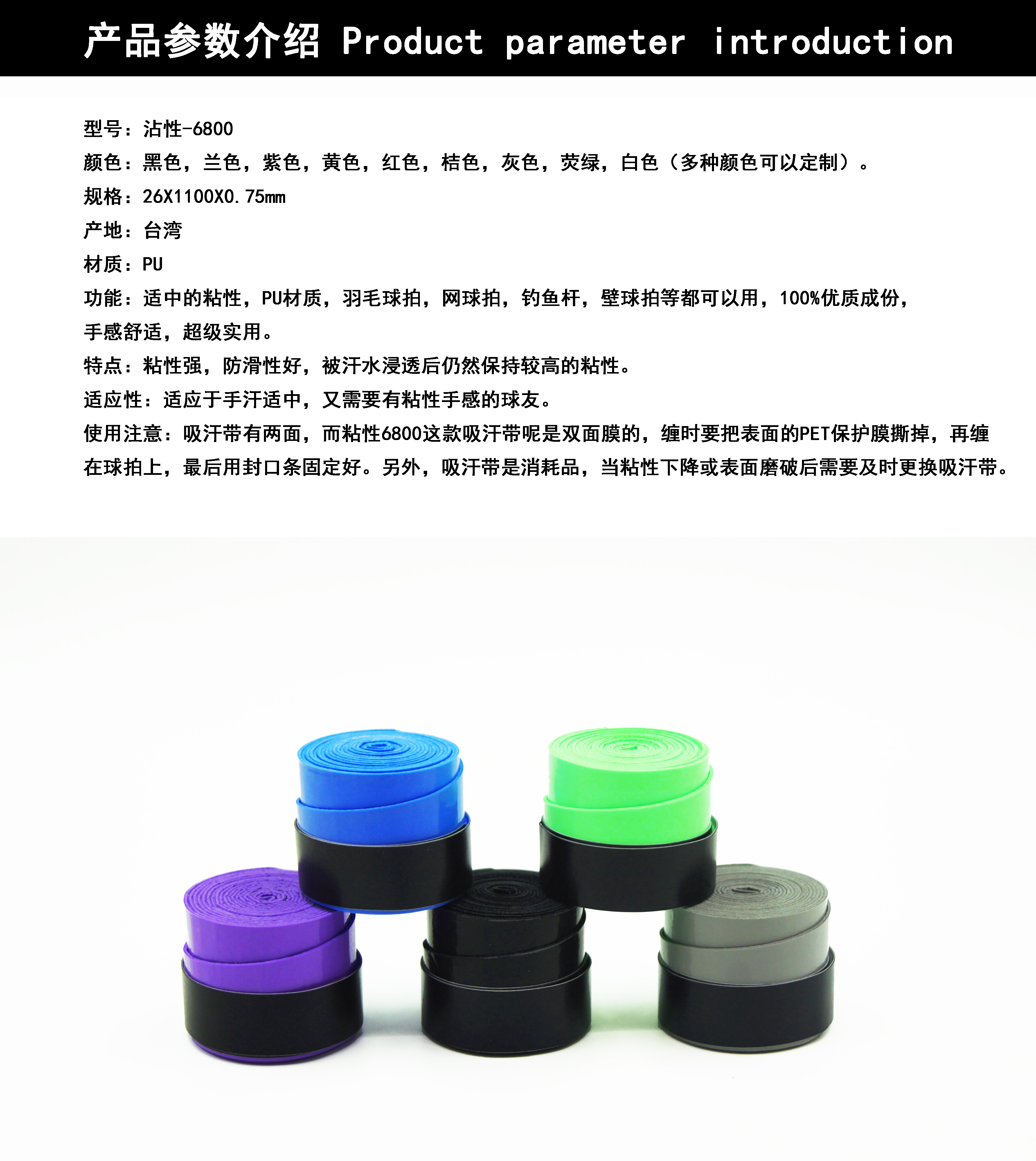 功能:特好的粘性,PU材質,羽毛球拍,網球拍,釣魚桿,壁球拍等都可以用,100%優質成份,手感舒適,超級實用。